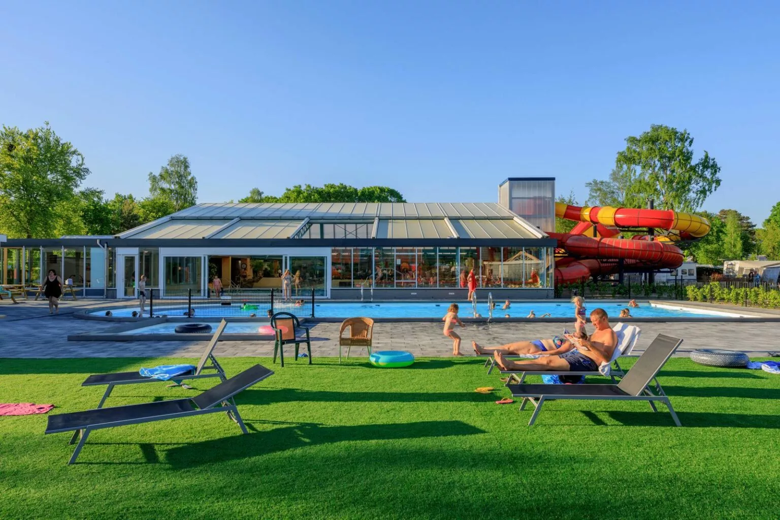 Wandel de natuur in, neem een verfrissende duik in het binnen- en buitenzwembad mét twee waterglijbanen, ravot in de speeltuin en voor wie durft kan naar het trampolinepark. Nadien is het goed toeven in uw chalet. Oftewel, ideaal voor een familievakantie.