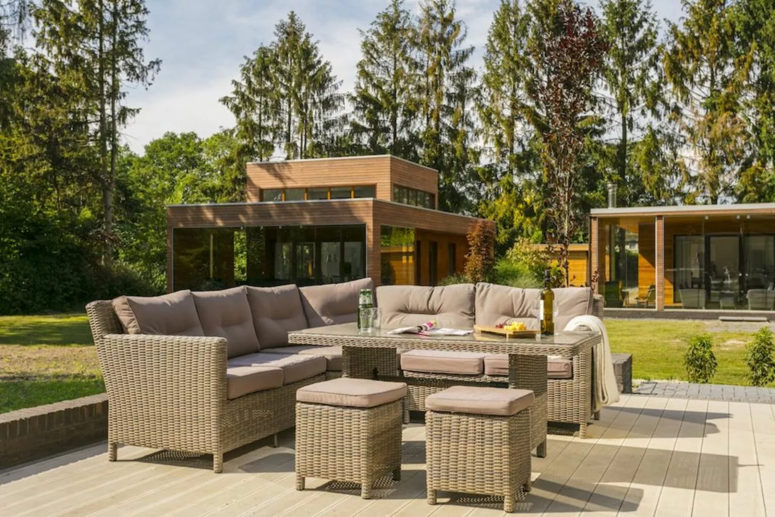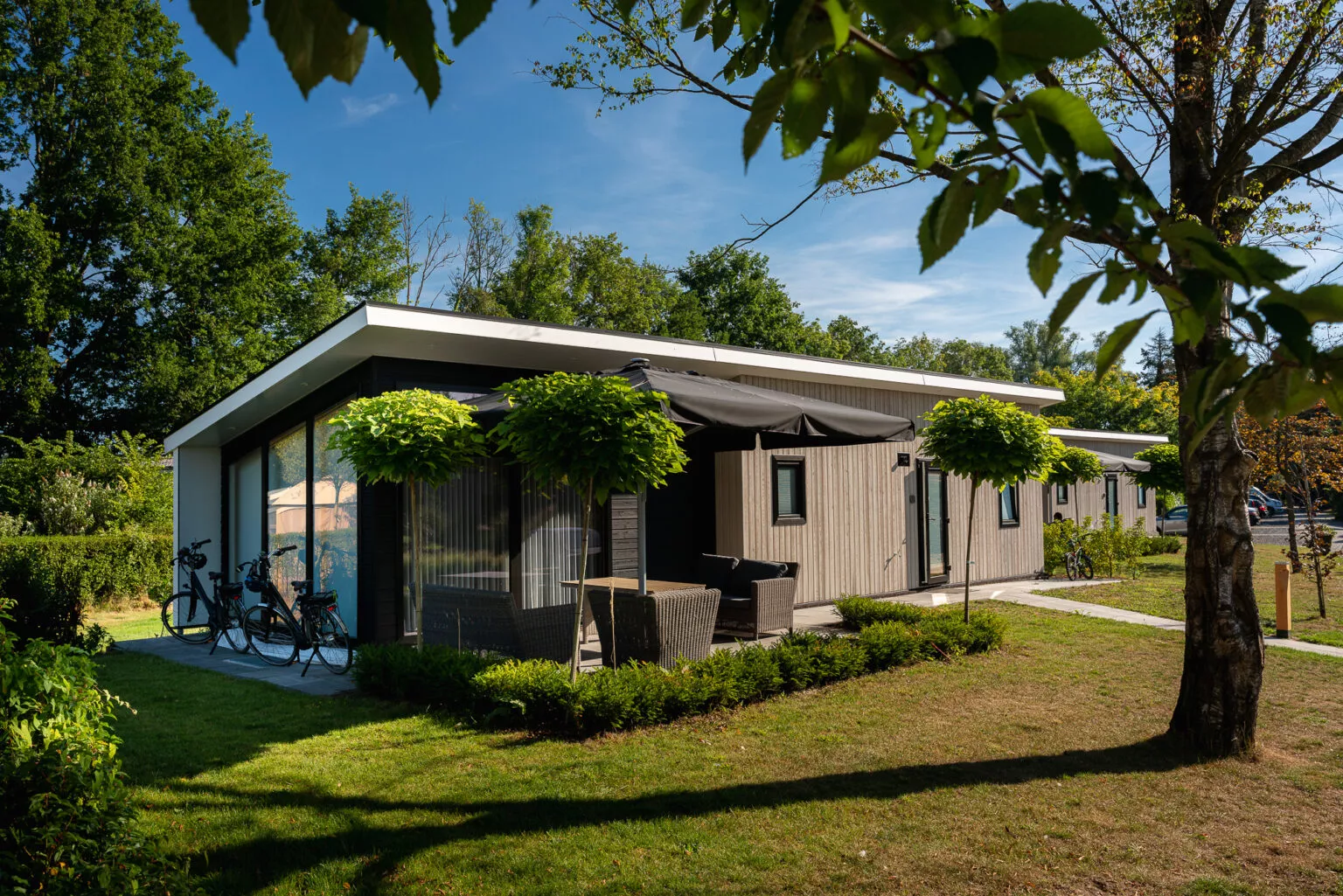 - Verblijf in stijlvolle lodges met terras